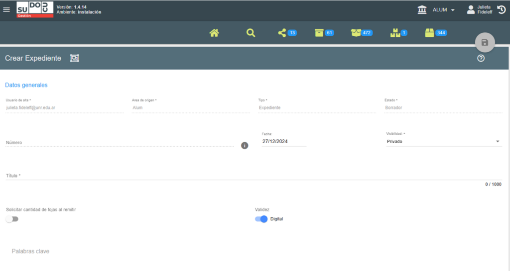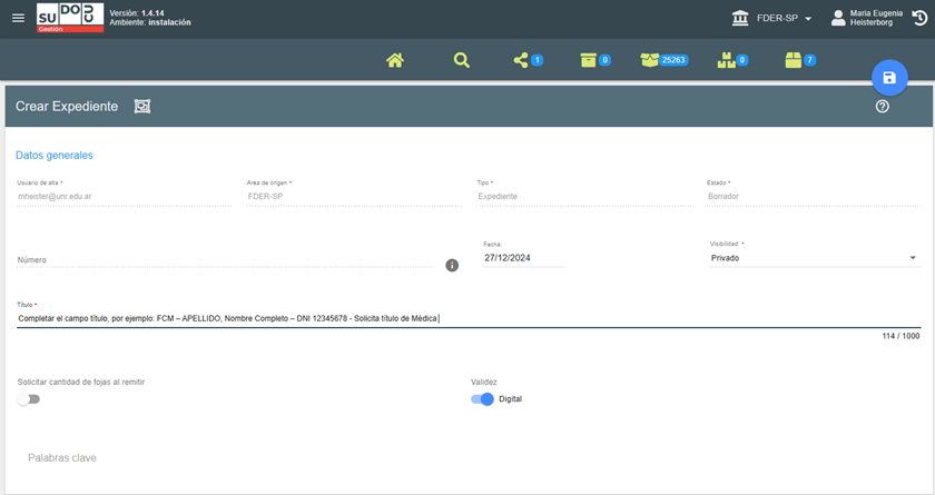 El campo obligatorio para guardar el expediente es el título. Como verán si no está ingresado el título, aparece este ícono en color gris